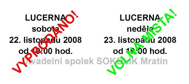O vstupenky na premiéru divadelní hry Lucerna v podání mratínského divadelního spolku Sokolík (TJ Sokol Mratín) je vskutku nevídaný zájem. Vstupenky na sobotní představení byly rozprodány během několika hodin. Nechcete-li si tuto, pro Mratín významnou, událost nechat ujít, zakupte si vstupenku na nedělní představení. Jejich prodej zajišťuje paní Marie Šulcová v budově Obecního úřadu.